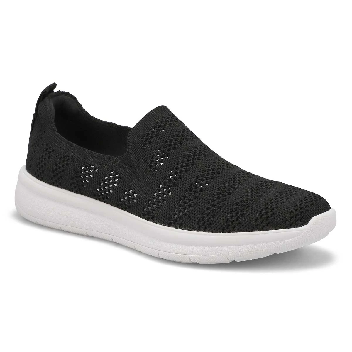 The Ezera Path black slip on sneaker from Clarks sports a stretchy top-line for easy wear. Woven textile and synthetic upper with reinforced details at toe and heel so you can walk with comfort this season Contrast manmade outsole adds the perfect sporty finish. OrthoLite footbed enhances comfort while reducing impact. Cushion Soft technology in the footbed features a high-rebound foam inlay to absorb impact.