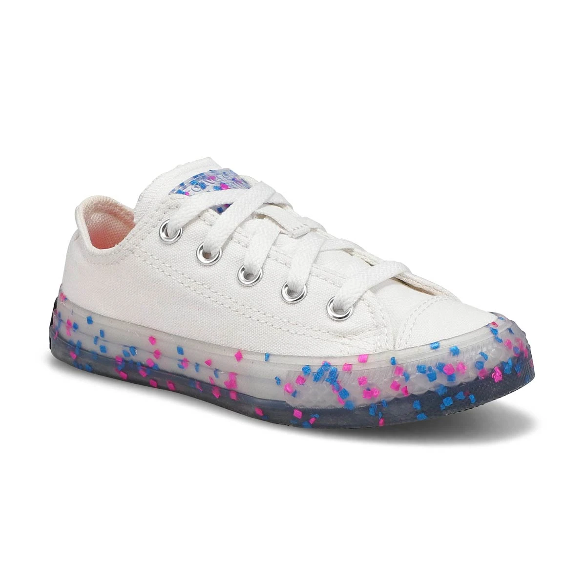 It’s a thinner, lighter version of the authentic Chuck. The Chuck Taylor All Star Confetti white/ pink/ blue sneaker from Converse puts a fresh spin on the icon. Featuring a canvas upper with a cushioned footbed. Lace-up front with metallic eyelets detail. The All Star Seasonal is designed with their Signature Chuck Taylor rubber toe box. Vulcanized rubber outsole for traction.