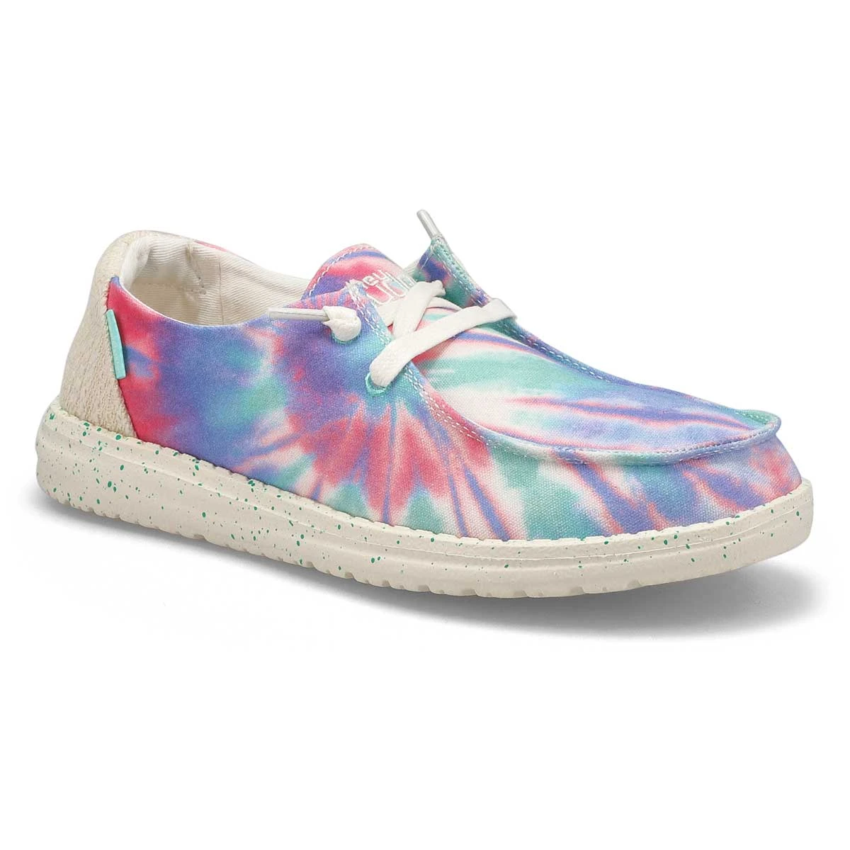 The Wendy rose candy tie dye casual from HEYDUDE will be an instant favorite in your casual collection. Featuring a linen upper with a round toe design. Low-top, chukka construction with a soft, oxford cloth lining that surrounds the foot in comfort. Memory foam cushioned, removable insole. The Wendy casual shoe is designed with an ultra-light, lugged synthetic outsole.