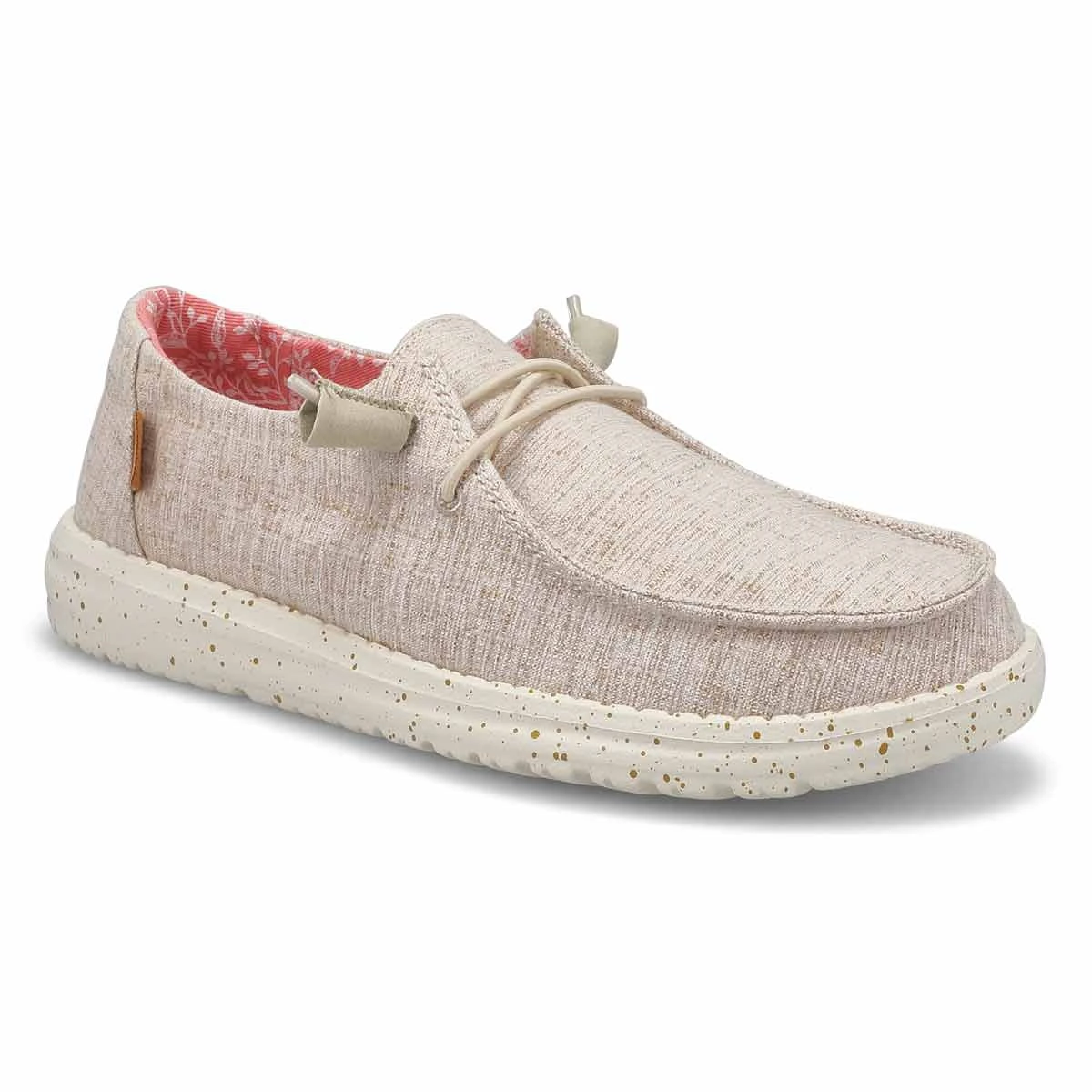 The Wendy Chambray casual from HEYDUDE will be an instant favorite in your casual collection. Featuring a chambray upper with a round toe design. Low-top, chukka construction with a soft, oxford cloth lining that surrounds the foot in comfort. Memory foam cushioned, removable insole. The Wendy Chambray casual shoe is designed with an ultra-light, lugged synthetic outsole.