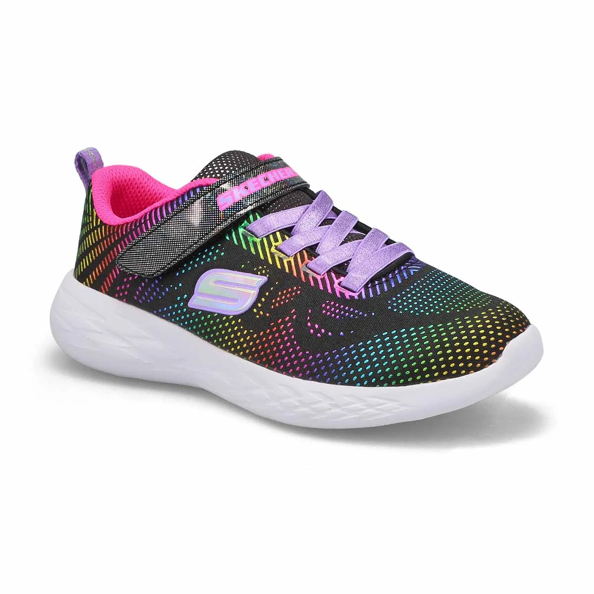 The Go Run 600 Shimmer Speeder navy/ multi sneaker from Skechers is a well-cushioned, lightweight trainer perfect for running, walking and playtime. The responsive cushioning midsole and a breathable mesh upper offer an incredibly responsive athletic shoe. Breathable mesh fabric and synthetic upper. Lightweight and well ventilated upper design. All over rainbow ombre metallic pattern.