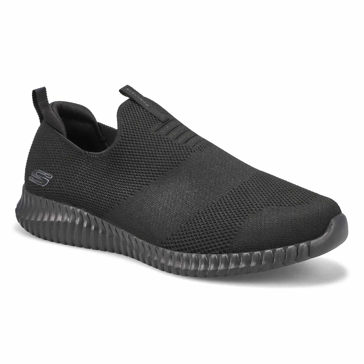 Take flexibiilty and comfort to an entirely new level with the Elite Flex Wasik black slip on shoe from Skechers. Featuring a Skech Knit Mesh fabric upper in a slip on sporty comfort walking and training sneaker with interwoven designs. Air Cooled Memory Foam insole, highly flexible comfort midsole. Flexible outsole with flexible articulated traction design.